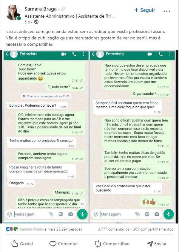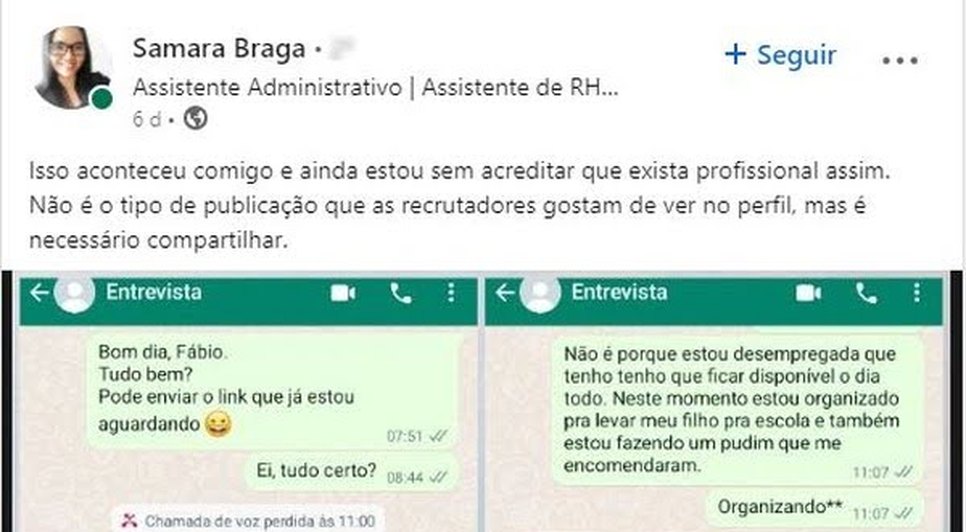 O diálogo ocorreu em uma conversa pelo WhatsApp no início do mês. Samara Braga, de 32 anos, está desempregada há 2 meses e resolveu compartilhar a situação no LinkedIn, como um alerta para outros profissionais da área. Até esta quarta-feira (13), a publicação recebeu mais de 3,9 mil comentários.