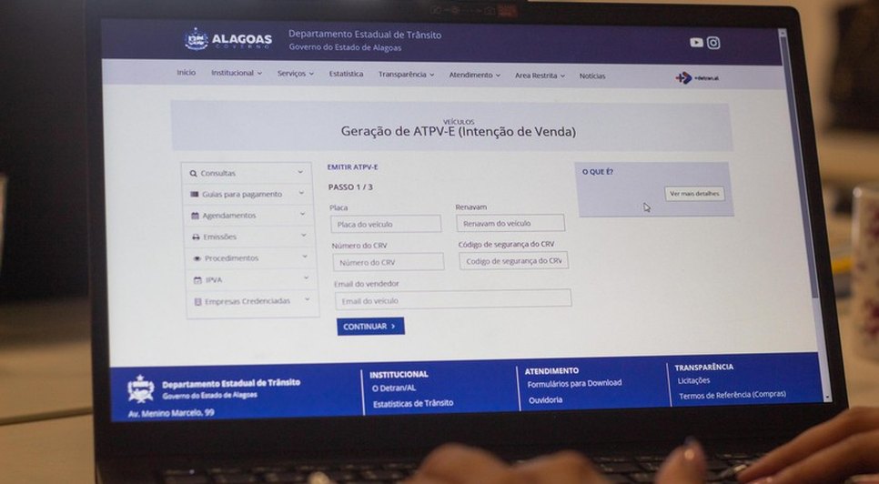 Antes, o usuário precisava entrar no site do Detran, abrir um requerimento e ir à sede fazer a solicitação. A partir de agora, essa etapa foi digitalizada, e a solicitação deve ser feita pelo site do Detran, no link https://www.detran.al.gov.br/veiculos/emissao/atpv-e.