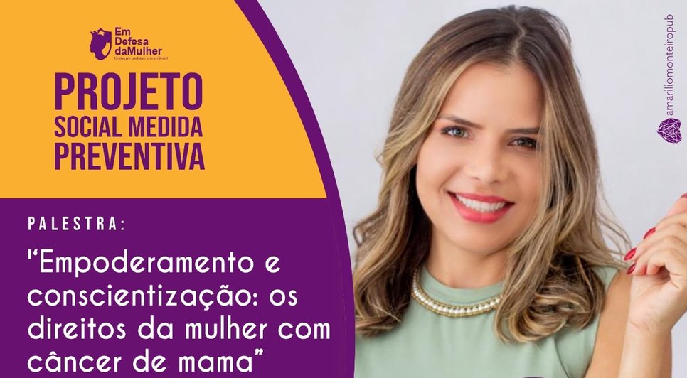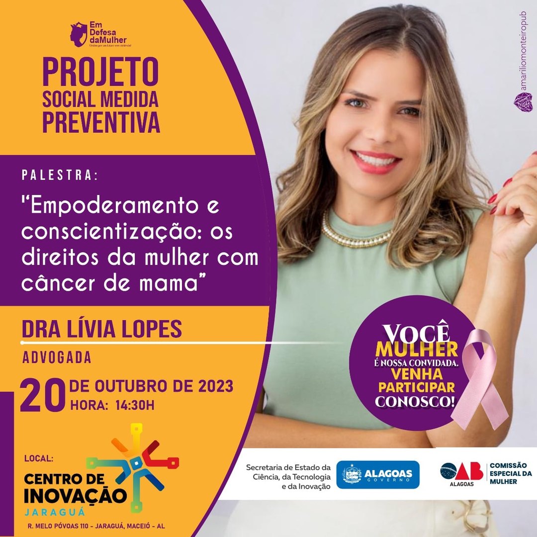 No próximo dia 20 de outubro, a advogada Dra. Lívia Lopes estará no Centro de Inovações do Jaraguá para ministrar uma palestra no Projeto Social Medida Preventiva, com o tema: “Empoderamento e conscientização: os direitos da mulher com câncer de mama”. A especialista, com mais de uma década de atuação nas áreas de direito previdenciário e trabalhista, focará sua apresentação na importância do empoderamento e dos direitos das mulheres que enfrentam o desafiador diagnóstico de câncer de mama.