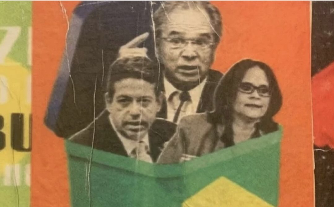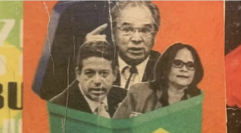 A exposição recebeu patrocínio da própria Caixa Econômica e do governo federal. A obra em questão é uma colagem de inúmeras imagens em pequenos quadradinhos. Além da representação de Arthur Lira, Damares e Guedes dentro de uma lata de lixo, outra parte mostra o que parece ser o ex-presidente Jair Bolsonaro (PL), agachado, sem calças, defecando sobre a bandeira do Brasil.