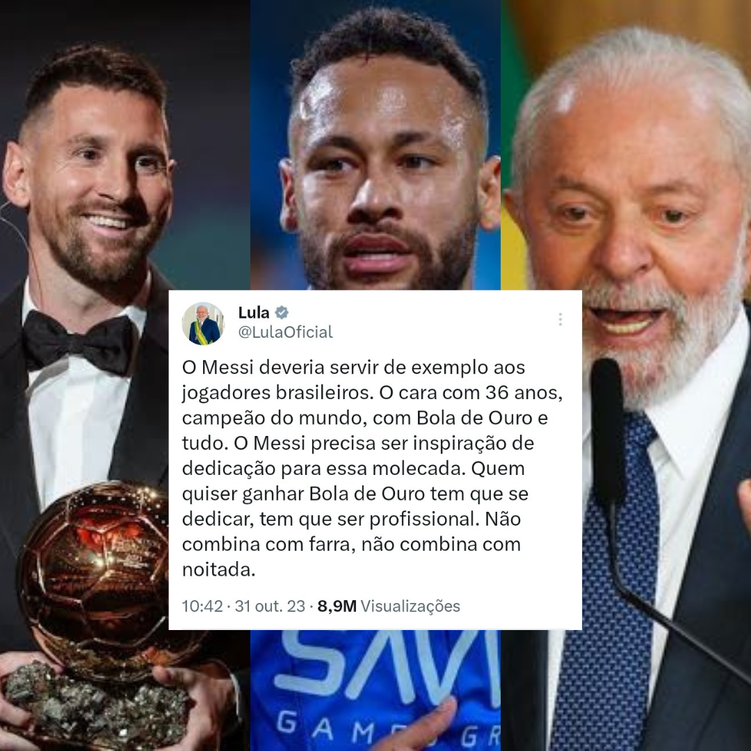 O presidente Luiz Inácio Lula da Silva fez um post, em uma de suas redes sociais, parabenizando o jogador argentino Messi, que ganhou, pela oitava vez, a Bola de Ouro da FIFA, prêmio almejado por diversos jogadores pelo mundo. E internautas, apontaram uma suposta indireta para o jogador brasileiro, Neymar.