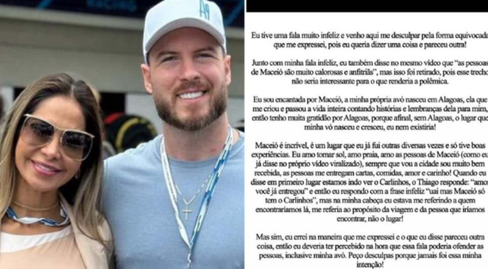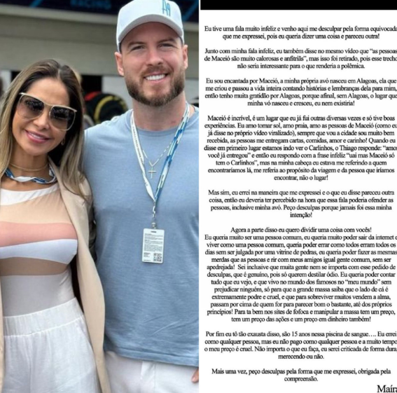 Maíra Cardi usa perfil do marido para se desculpar após sua fala sobre Maceió "eu tive uma fala muito infeliz"