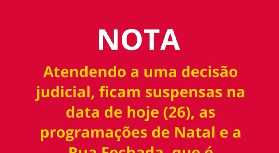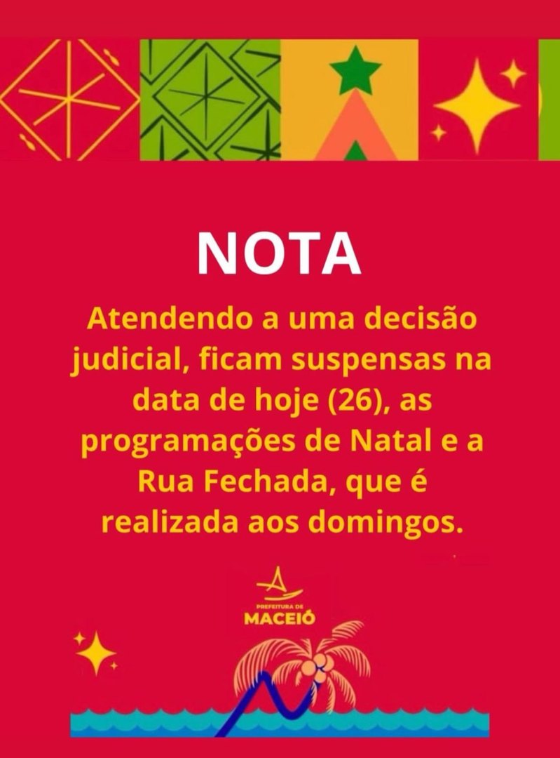 Maceió, a Prefeitura de Maceió comunicou que a programação de Natal e da Rua Fechada foram suspensas, após determinação judicial.