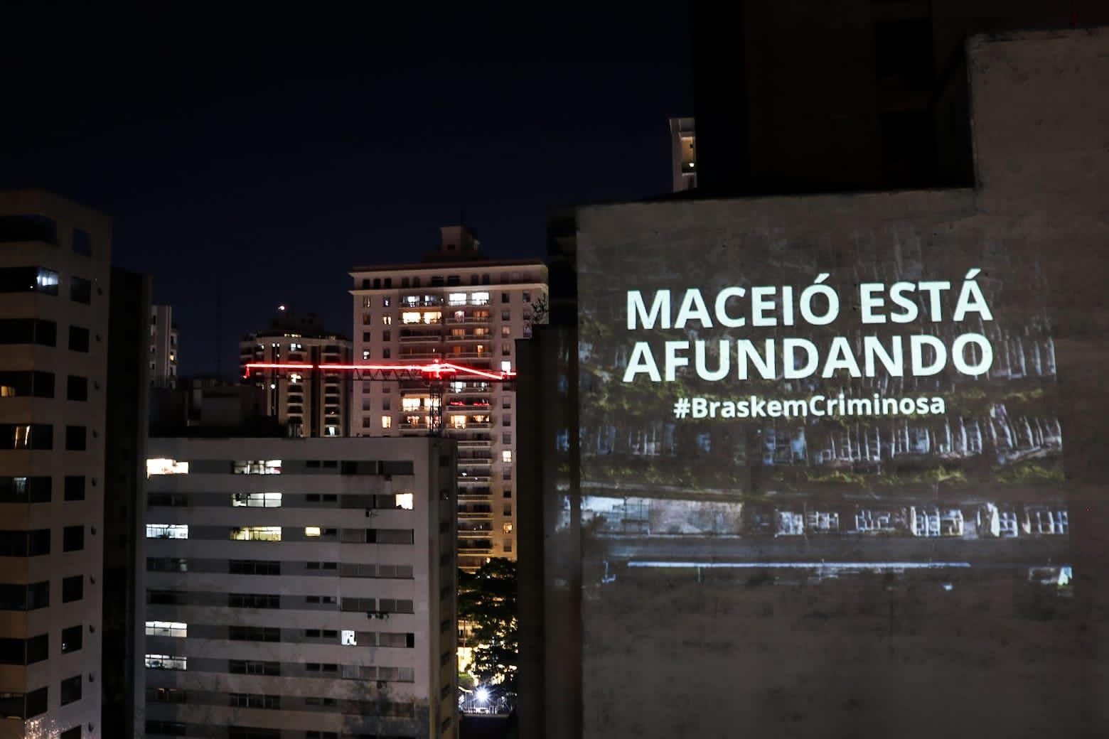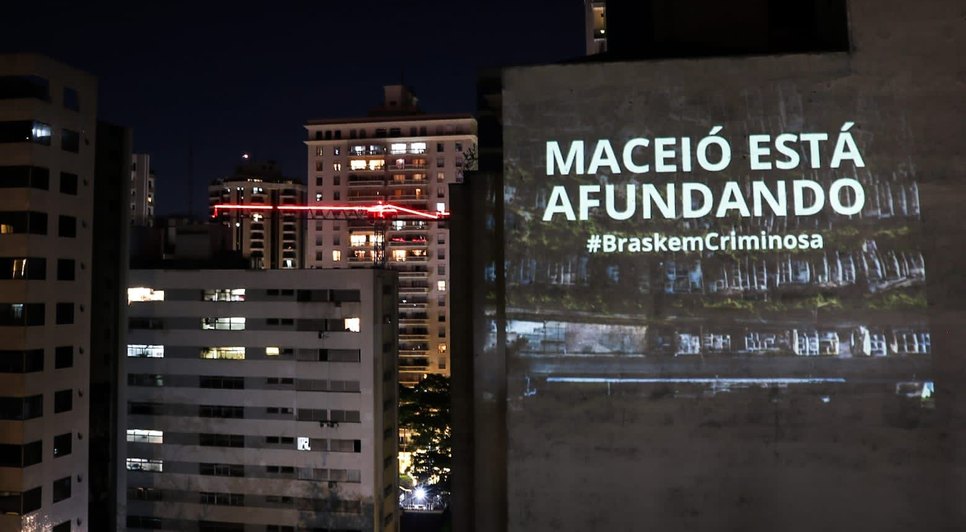 Prédios em São Paulo estão sendo utilizados para projetar mensagens de denúncia contra o crime ambiental provocado pela empresa Braskem. A situação na capital alagoana vem ganhando repercussão nacional.
