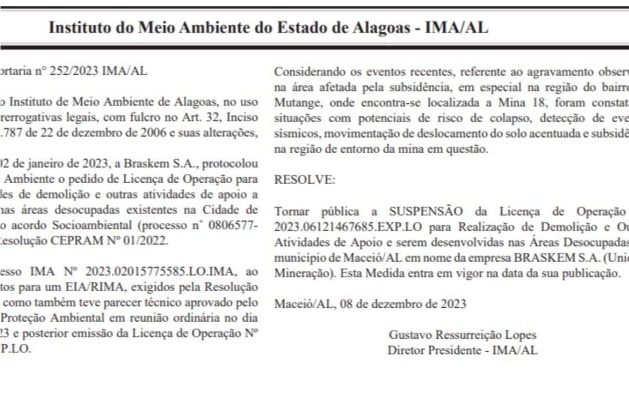 No último dia 5 de dezembro, o Instituto do Meio Ambiente - IMA/AL - divulgou uma nota em seu site onde informou que autuou a mineradora Braskem por "danos ambientais e pelo risco de colapso e desabamento da mina 18, na região do Mutange, em Maceió".