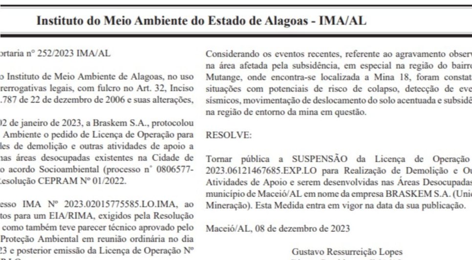 Se a Lei fosse cumprida e os documentos devidamento cobrados, Braskem seria obrigada a revelar nos desabamento de minas antes dos tremores de 2018 e atenuado o caos instalado em Maceió. O que não ocorreu e por conta dessa licença, o caos tomou conta dos bairros que foram afetados drasticamente.