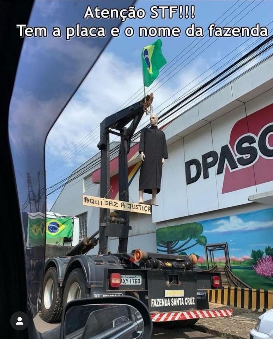 Nas imagens é possível ver um boneco, que representaria o ministro, enforcado em cima de um caminhão. No veículo é possível também ver a identificação "Fazenda Santa Cruz", além da placa.