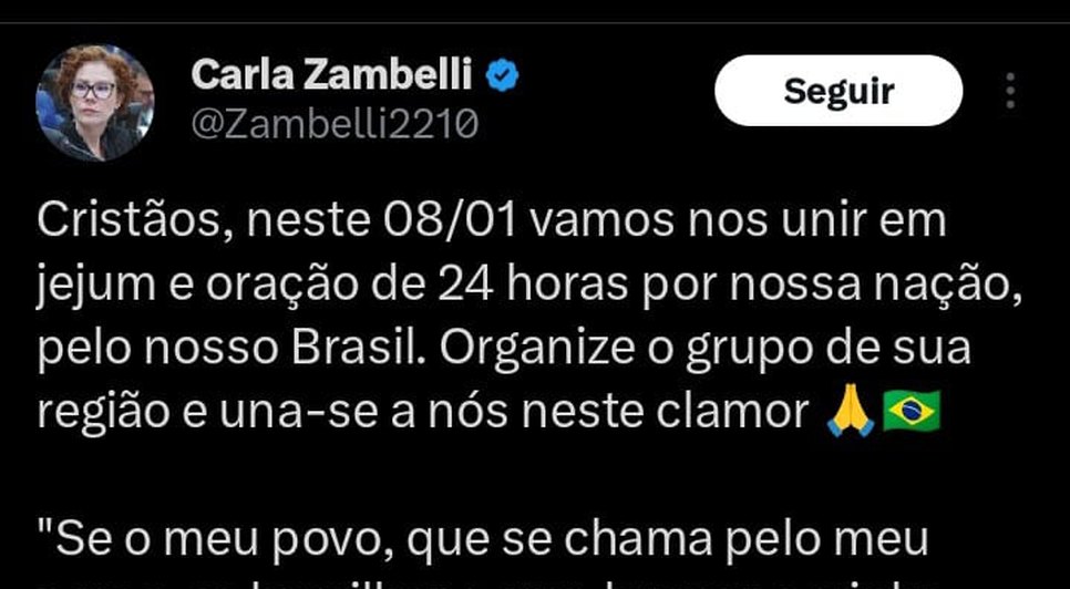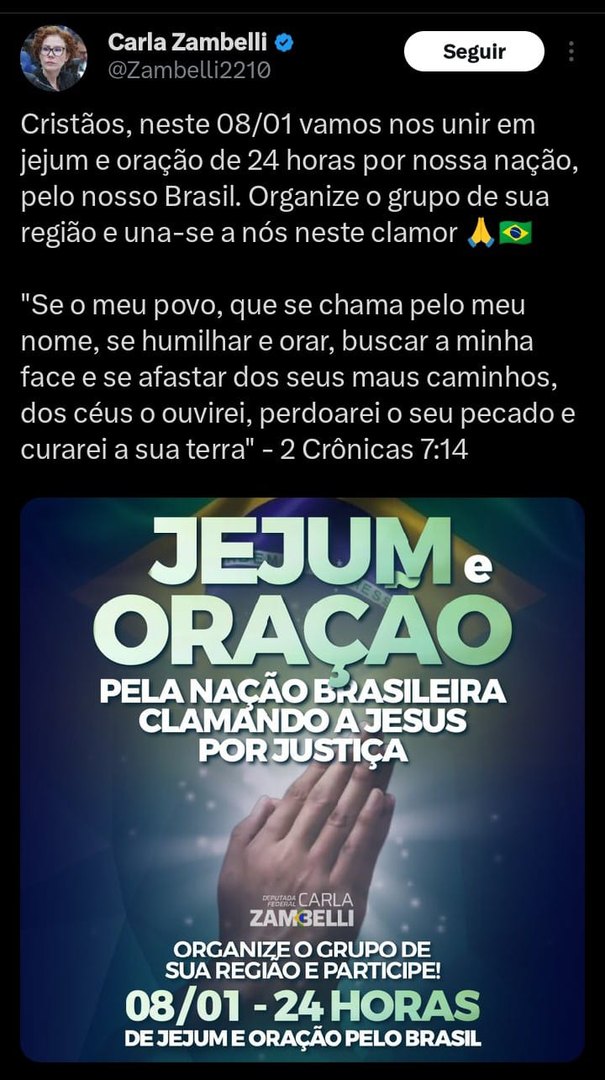 No mesmo dia do aniversário de um ano dos atos golpistas do 8 de janeiro, a deputada federal Carla Zambelli (PL) realizou um jejum de 24h "pela nossa nação e pelo nosso Brasil", conforme publicação feita pela parlamentar no X (antigo Twitter), na segunda-feira (8).