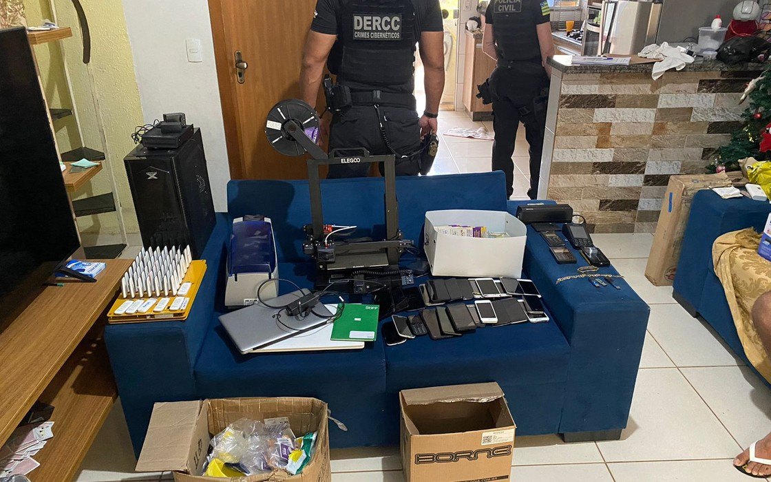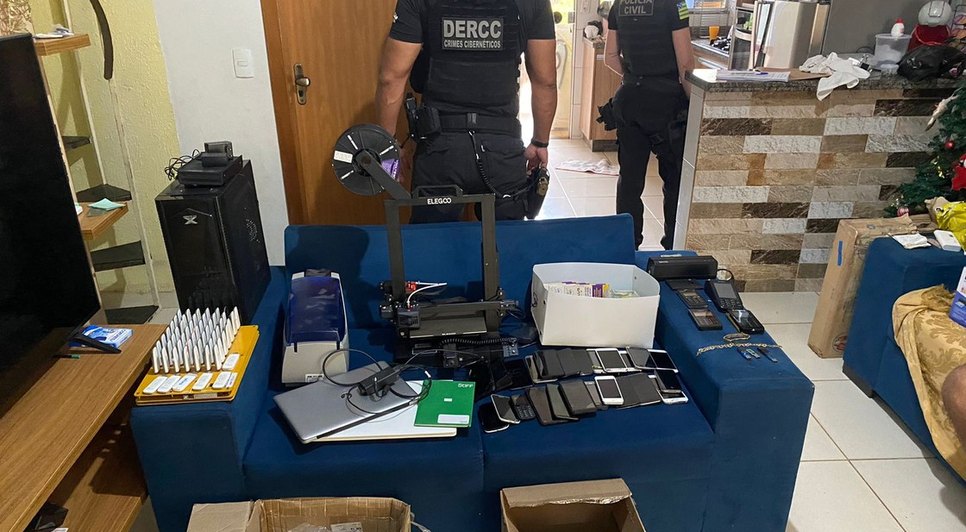Além do mandado de prisão preventiva, a delegacia cumpriu dois mandados de busca e apreensão domiciliar. No local, foram encontrados aparelhos telefônicos, computadores, notebooks, máquina de impressão 3D, máquina de impressão de cartão, HD e chips de celulares.