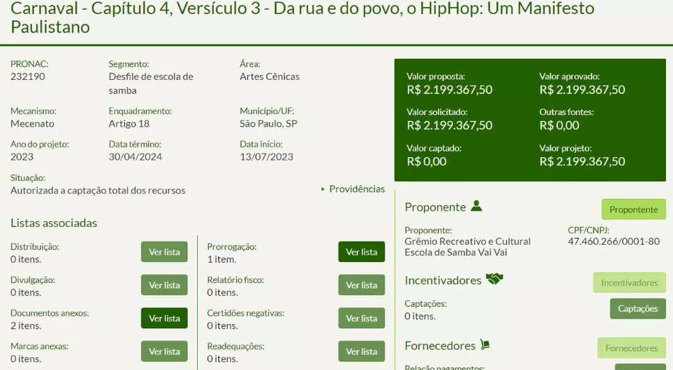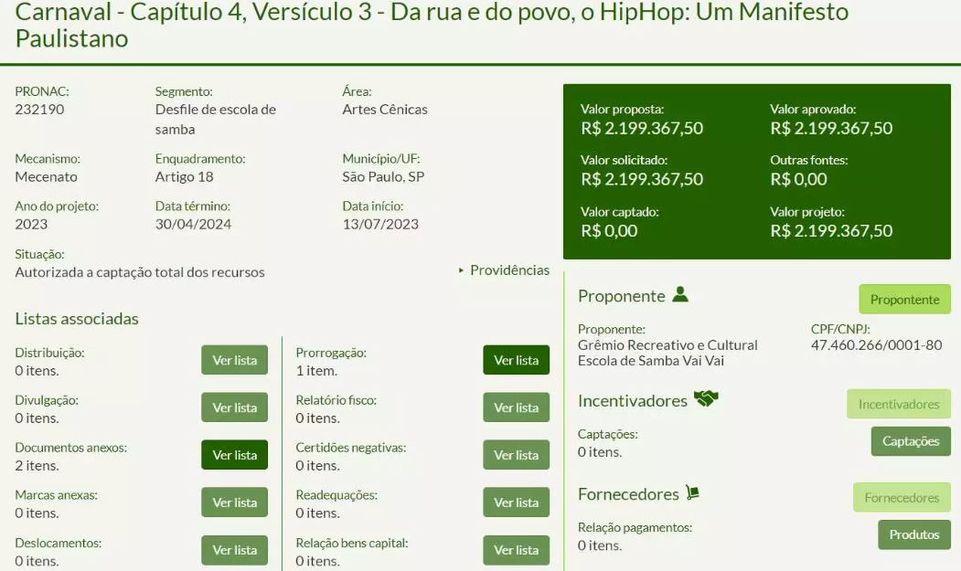 A escola de samba paulista 'Vai-Vai' foi autorizada a captar pelo menos R$ 2,1 milhões para seu desfile deste ano por meio da Lei Rouanet. A autorização foi dada pelo Ministério da Cultura em julho de 2023. Inicialmente, a escola poderia obter os recursos até 31 de dezembro. Em janeiro, o governo prorrogou o prazo até abril de 2024.