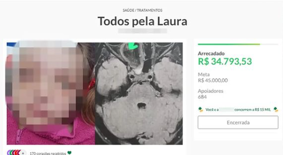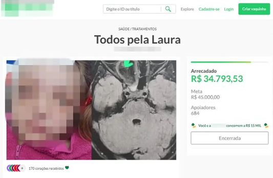 Uma das vaquinhas estava em nome de Laura Oliveira Santos, e acompanhava um texto, supostamente escrito pela mãe da menina, que dizia que ela teria um tumor nos olhos. A arrecadação do dinheiro seria para realizar uma segunda cirurgia e pagar exames.