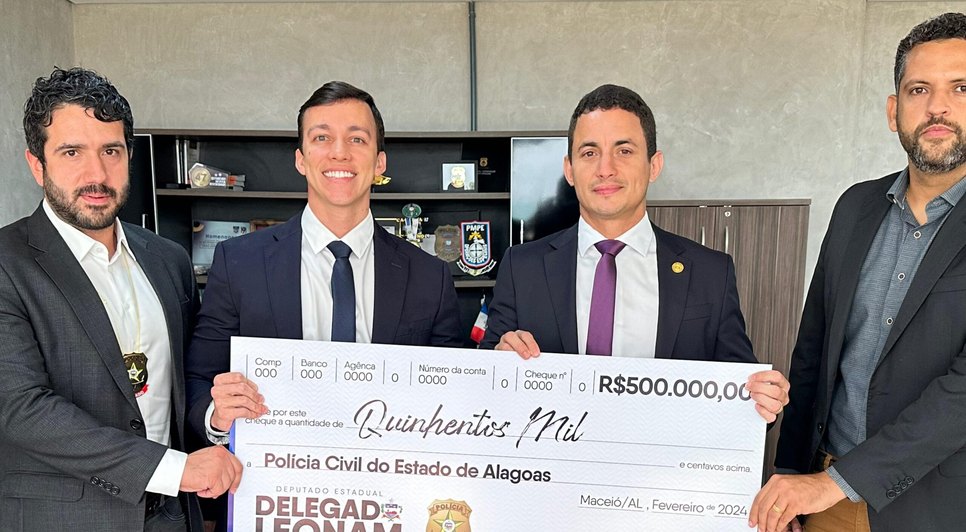 O deputado Delegado Leonam (União Brasil) reforçou seu compromisso com a segurança pública do Estado e destinou R$ 500 mil para a Polícia Civil do Estado de Alagoas. Nesta quarta-feira, 28, o parlamentar esteve na sede da delegacia-geral de Polícia e foi recebido pelo delegado-geral, Gustavo Xavier e pelos delegados Eduardo Melo e Daniel Mayer. Na ocasião, o parlamentar entregou um cheque simbólico com o valor de sua emenda, que é impositiva, e será liberada posteriormente pelo Governo do Estado.