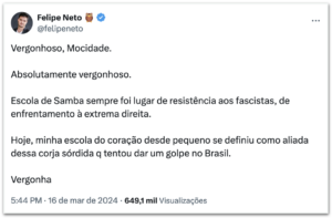 Em sua conta X, antigo Twitter, Felipe Neto expressou seu descontentamento com a Mocidade, de quem sempre gostou desde pequeno. "Aboslutamente vergonho. Escola de Samba sempre foi lugar de resistênca aos facistas".