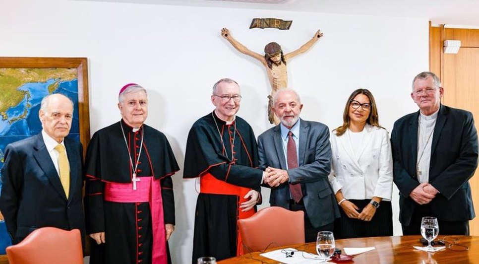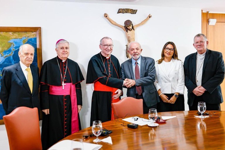 O presidente Luiz Inácio Lula da Silva recebeu nesta segunda-feira, 8 de abril, no Palácio do Planalto, o secretário de Estado do Vaticano, cardeal Pietro Parolin. Acompanharam a reunião a primeira-dama Janja da Silva e o assessor especial da Presidência, embaixador Celso Amorim. Após relembrar ao presidente Lula da última vez em que o encontrou, por ocasião da coroação do rei Charles, do Reino Unido, o representante do Vaticano transmitiu as saudações do papa Francisco.