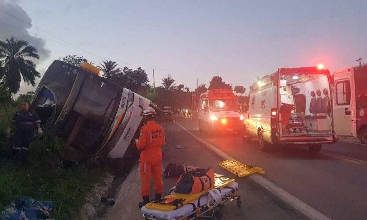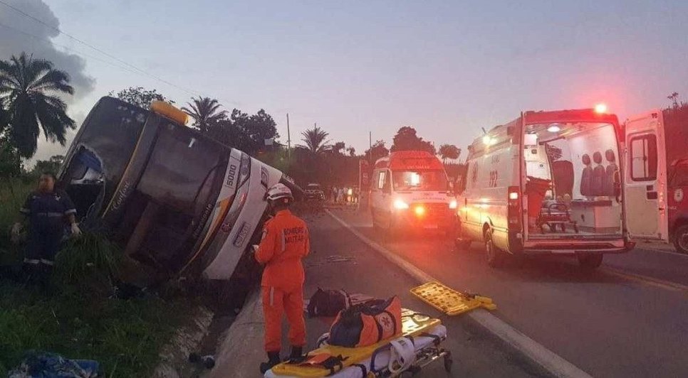 Um acidente com um ônibus de turismo deixou oito mortos, além de 23 feridos, na BR-101, na Bahia. O veículo, que tinha 34 pessoas a bordo, tombou depois de bater em um barranco, na cidade de Teixeira de Freitas, por volta das 4h30 da madrugada desta quinta-feira (11).