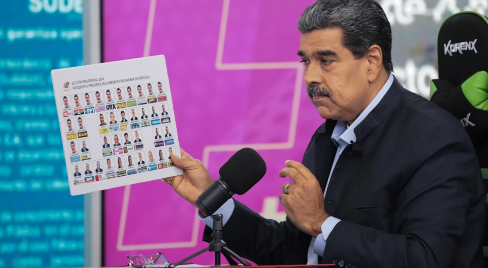 O presidente da Venezuela, Nicolás Maduro, apresentou na segunda-feira (22) o modelo da cédula de votação que deve ser usada nas próximas eleições presidenciais do país, marcadas para o dia 28 de julho. Na cédula apresentada, sua foto aparece 13 vezes. O documento tem uma configuração com 13 candidatos indicados por 37 partidos, definida pelo CNE (Conselho Nacional Eleitoral).