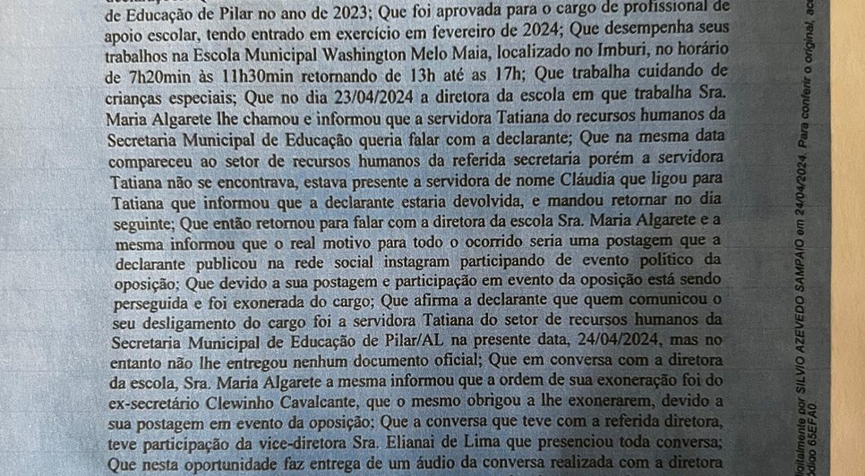 Gerlane entregou uma gravação em áudio da conversa que teve com a diretora da escola na presença da vice-diretora. “A ordem de sua exoneração foi do ex-secretário Clewinho Cavalcante, que o mesmo obrigou a lhe exonerarem, devido a sua postagem em evento de oposição”, expõe um trecho do termo de declarações.