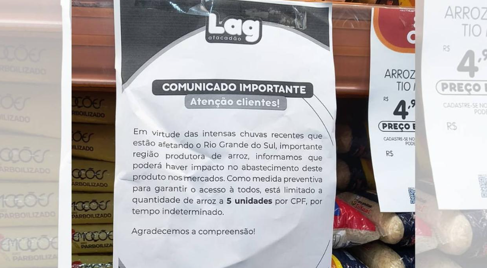 "Em virtude das intensas chuvas recentes que estão afetando o Rio Grande do Sul, importante região produtora de arroz, informamos que poderá haver impacto no abastecimento deste produto nos mercados. Como medida preventiva para garantir o acesso a todos, está limitada a quantidade de arroz a 5 unidades por CPF, por tempo indeterminado", informa o comunicado na prateleira do Atacadão Lag, no Mondubim, bairro em Fortaleza.