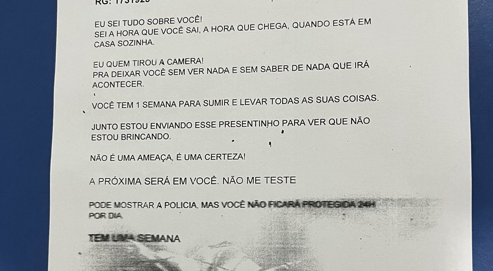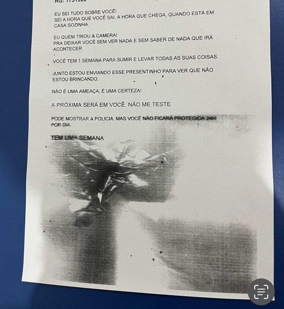 A mensagem no bilhete dizia: "Eu sei tudo sobre você! Sei a hora que você sai, a hora que chega, quando está em casa sozinha, Eu quem tirou a camara! Pra deixar você sem ver nada e sem saber de nada que irá acontecer. Você tem 1 semana para sumir e levar todas as suas coisas. Junto estou enviando este presentinho para ver que não estou brincando. Não é uma ameaça! É uma certeza! A próxima será você. Pode mostrar a Polícia, mas você não ficará protegida 24h por dia.