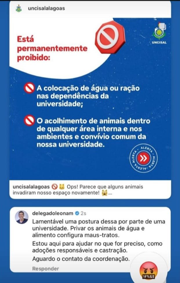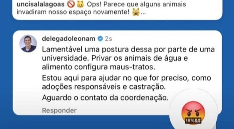 Ao ver a postagem, o deputado Leonam não escondeu sua indignação: "Lamentável uma postura dessa por parte de uma universidade. Privar os animais de água e alimento configura maus-tratos. Estou aqui para ajudar no que for preciso, como adoções responsáveis e castração. Aguardo o contato da coordenação".
