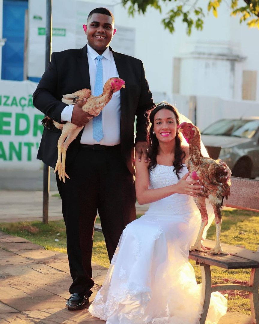 Casal faz ensaio de casamento com galo gigante que mede mais de 1 metro