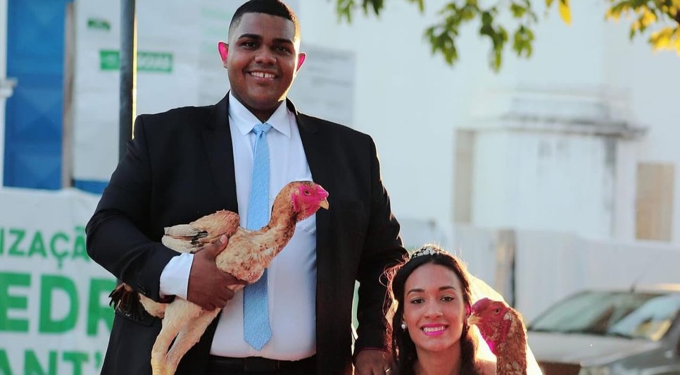 O empreendedor e youtuber Jurandir Neto e a noiva dele, Maria Eduarda Arruda, fizeram um ensaio de fotos de casamento nesta sexta-feira (31) , no Coreto da Cidade de Goiás, com um galo da raça índio-gigante que mede mais de 1 metro de altura.