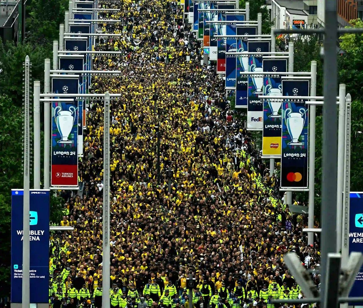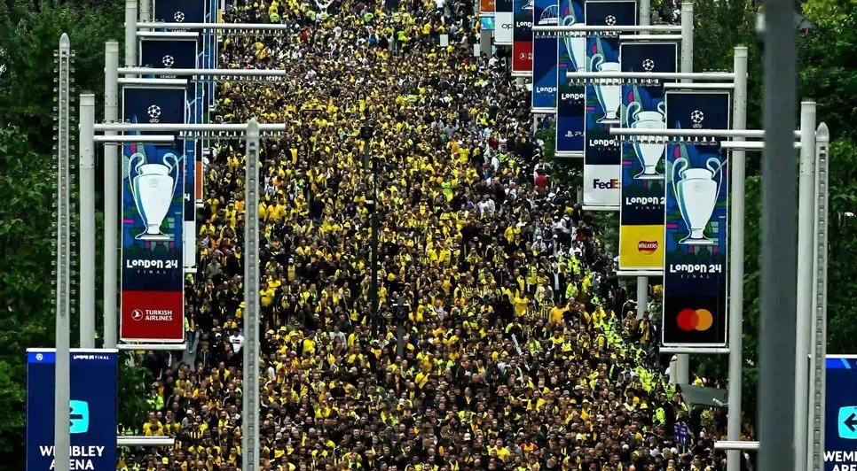Em imagens publicados nas redes sociais, é possível ver o mar amarelo se aproximando do palco onde acontecerá a grande final. Outro local que também está lotado é o centro da cidade de Dortmund, com milhares de torcedores aurinegros que não conseguiram viajar para assistir a final ao vivo, visto que os ingressos esgotaram rapidamente, a maioria comprados pelos alemães.