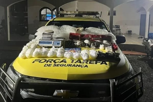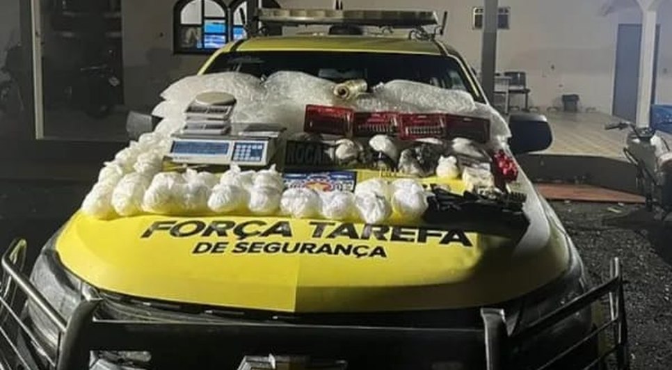 A ocorrência resultou na apreensão de mais de 7,5 quilos de cocaína, aproximadamente 4,2 quilos de pasta base de cocaína, 900 gramas de crack, mil pinos plásticos para embalar a droga, um revólver calibre 32, 147 munições de diversos calibres, três balanças de precisão, um caderno com anotações de valores e quantidades de drogas e uma motocicleta.
