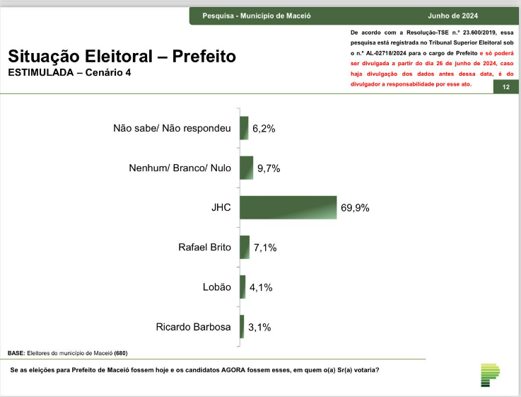 Já o atual prefeito, JHC (PL), lidera com folga e aparece com 70% na pesquisa. A gestão de JHC é aprovada por 76,9% dos moradores da Maceió. Já o trabalho do atual prefeito é avaliado positivamente por 2 a cada 3 (61,4%) entrevistados.