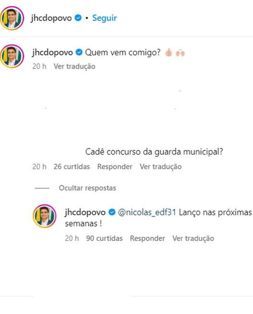 O prazo foi passado pelo prefeito de Maceió, João Henrique Caldas (o JHC). Em resposta a comentários nas redes sociais, o prefeito falou sobre o edital do concurso da Guarda Municipal: “Lanço nas próximas semanas”.