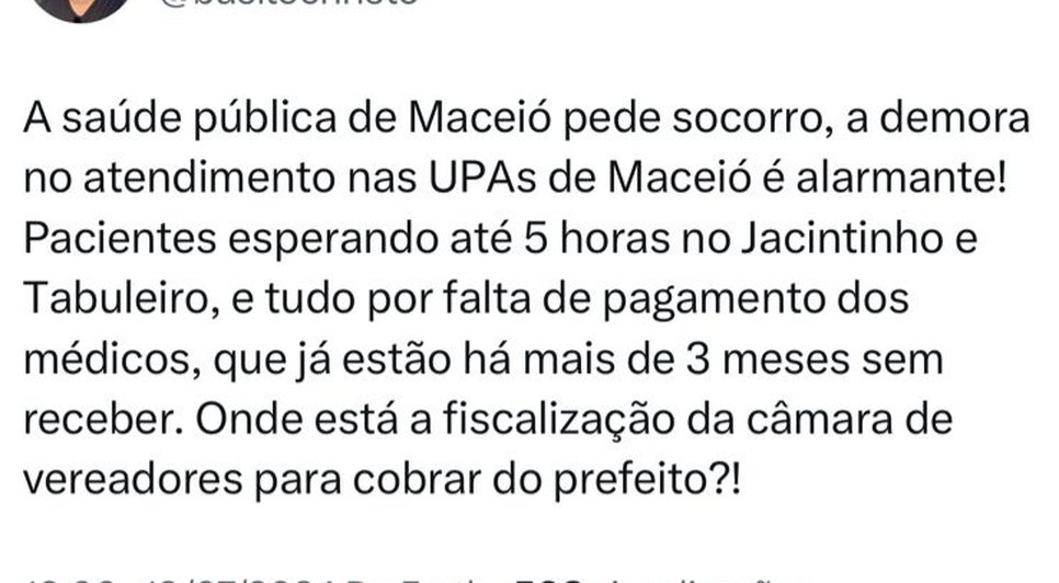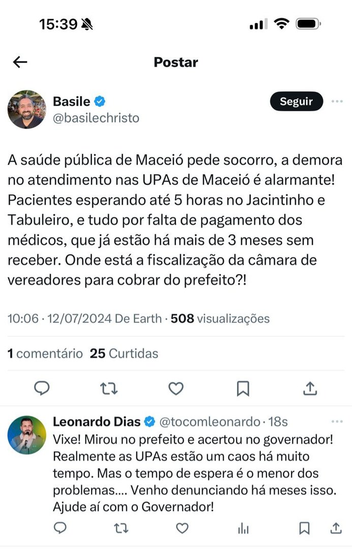 Integrante da base governista do emedebista Paulo Dantas, Basile se apressou em apagar o post, depois de ser alertado pelo vereador de mandato, Leonardo Dias (PL). "Vixe, mirou no prefeito e acertou no governador! Realmente as UPAs estão um caos há muito tempo", comentou o parlamentar.