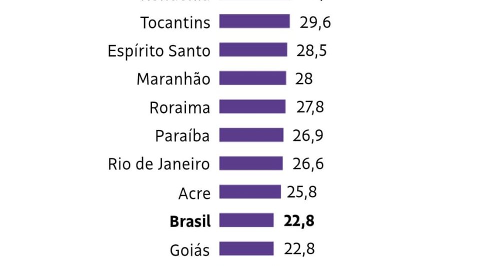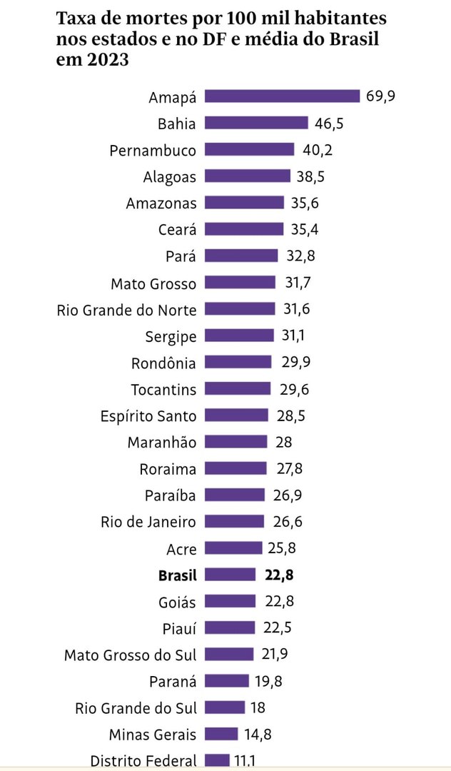 Enquanto o Brasil a média brasileira é de 22,8 mortes, para cada 100 mil habitantes, Alagoas dispara com assustadores 38,5, sendo a quarta maior taxa do país. Ficando atrás somente de Pernambuco (40,2), Bahia (46,5) e Amapá (69,9).