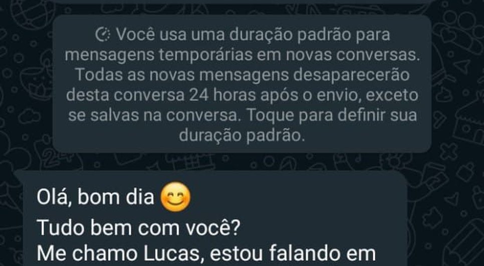 Na mensagem, Lucas diz falar em nome do Rafael - na condição de deputado federal - e em seguida, divulga ações de mandato do parlamentar, questionando se o receptor da mensagem conhece dois projetos do deputado.