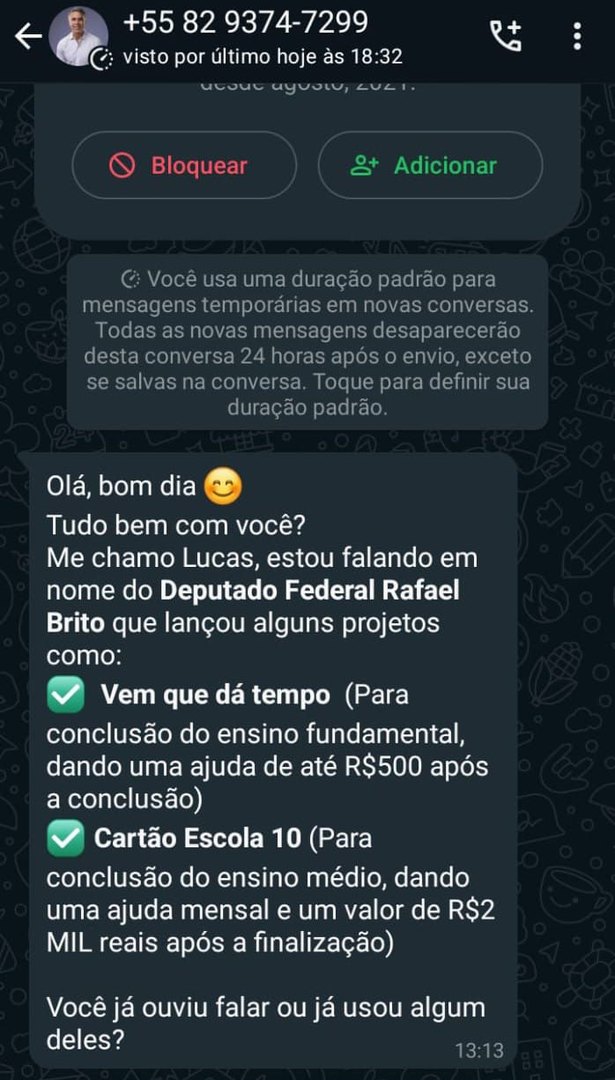 O print de uma mensagem enviada via Whatsapp por uma pessoa que se identifica como Lucas, com imagem de perfil do pré-candidato Rafael Brito (MDB), tem levantado questionamentos na web, de que Tio Rafa estaria usando a prática irregular de 'disparo em massa'. Se assim comprovada, a prática pode ser considerada abuso de poder político e econômico.