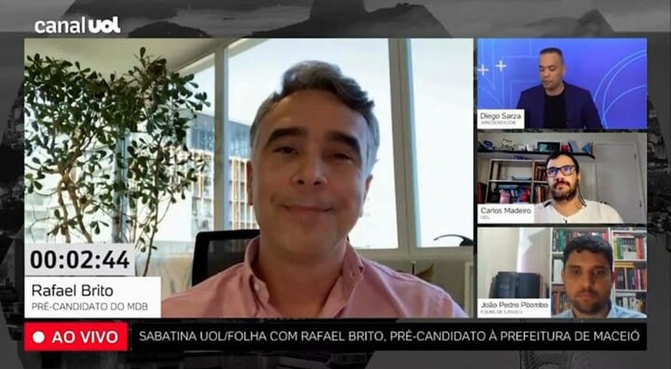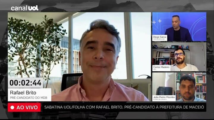 A Folha de São Paulo e o portal UOL, deram início, nesta terça-feira (30), à série de sabatinas aos três pré-candidatos que melhor pontuam na corrida pela Prefeitura de Maceió. Ricardo Barbosa (PT), que seria o segundo candidato a ser entrevistado, ficará de fora, após decisão do diretório Nacional de abrir mão de candidatura própria na capital, para apoiar Brito. Na sexta-feira (02), Lobão (Solidariedade) substitui Barbosa. O atual prefeito, JHC (PL), se recusou a participar da sabatina. Entre outros temas, Brito falou de alianças políticas, do caso Braskem, da saúde na capital alagoana e apontou o senador Renan Calheiros como 'mentor'.