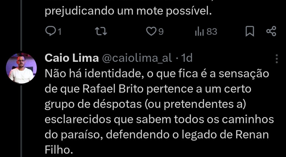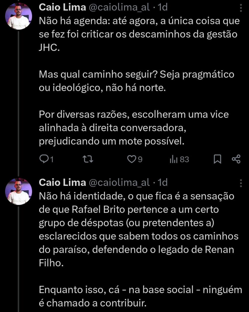 Através de publicações na rede social X (antigo Twitter), o assessor da vereadora Teca Nelma, Caio Lima, teceu duras críticas em avaliação às eleições municipais de Maceió deste ano.