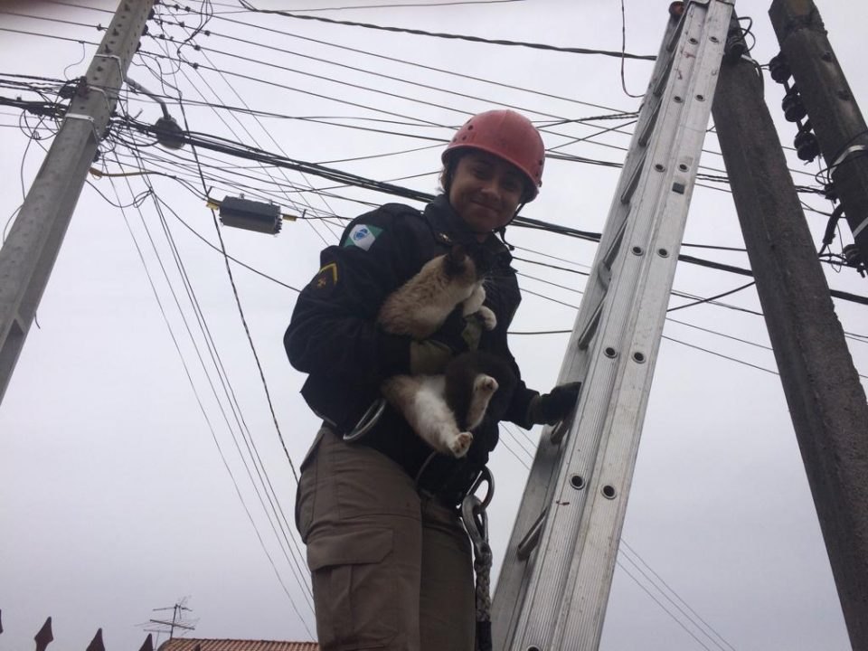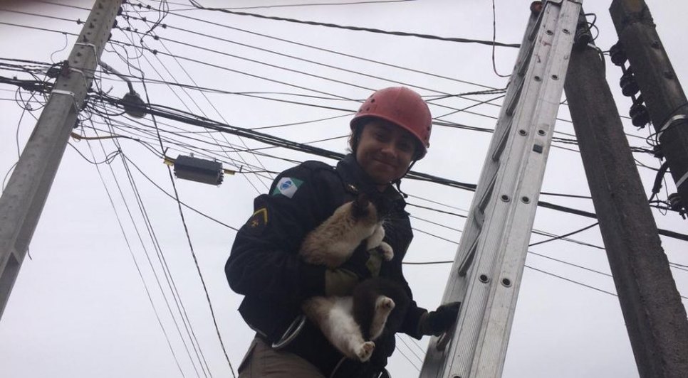 Menos uma vida? Bombeiros são acionados para resgatar gato em poste e precisam desativar eletricidade