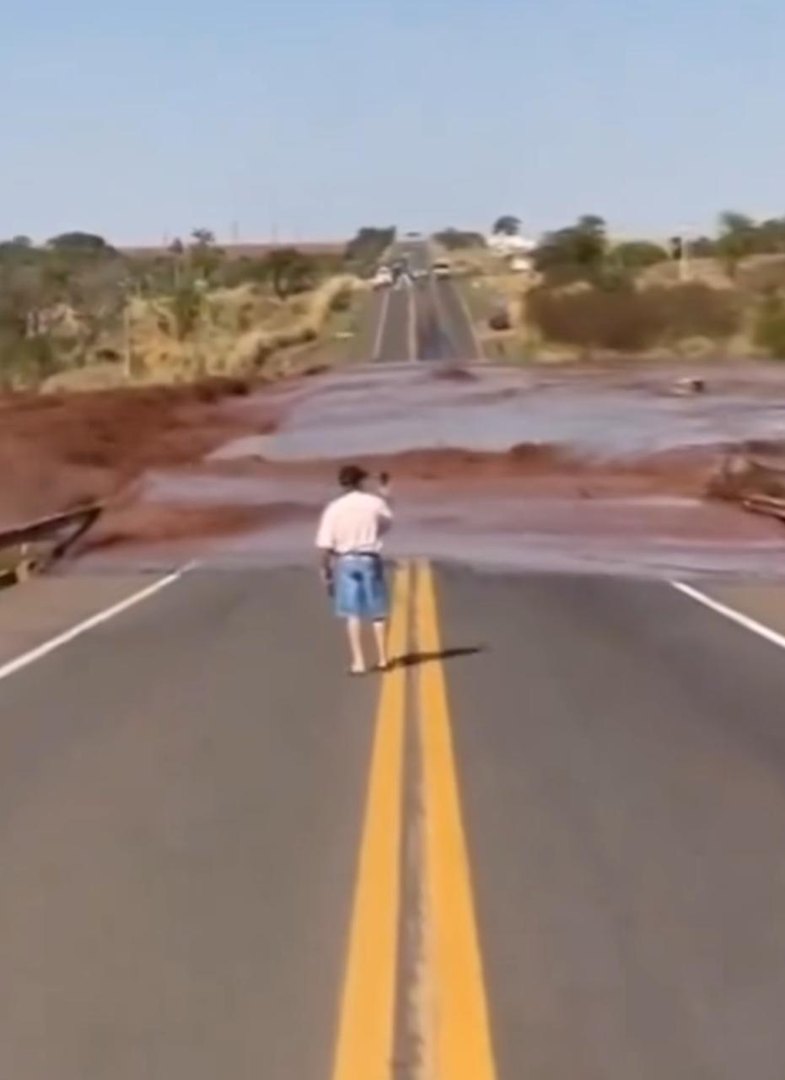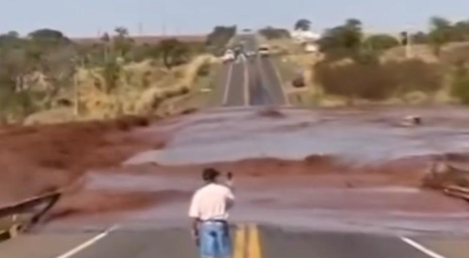 Imagens mostram o momento do rompimento da barragem e como a estrada ficou logo após.