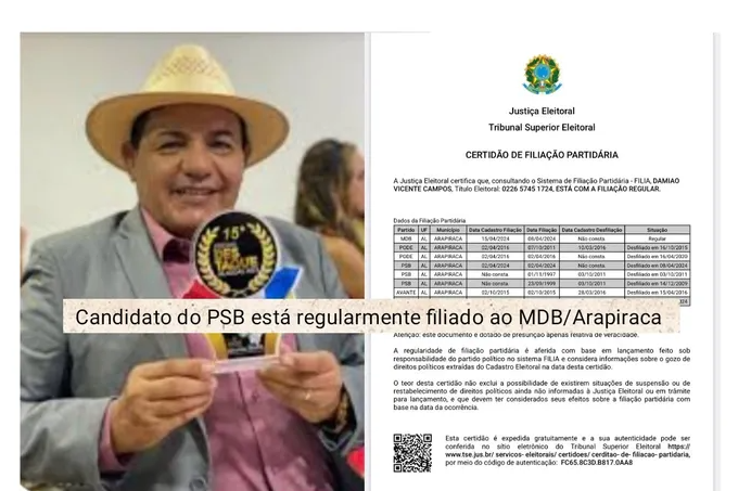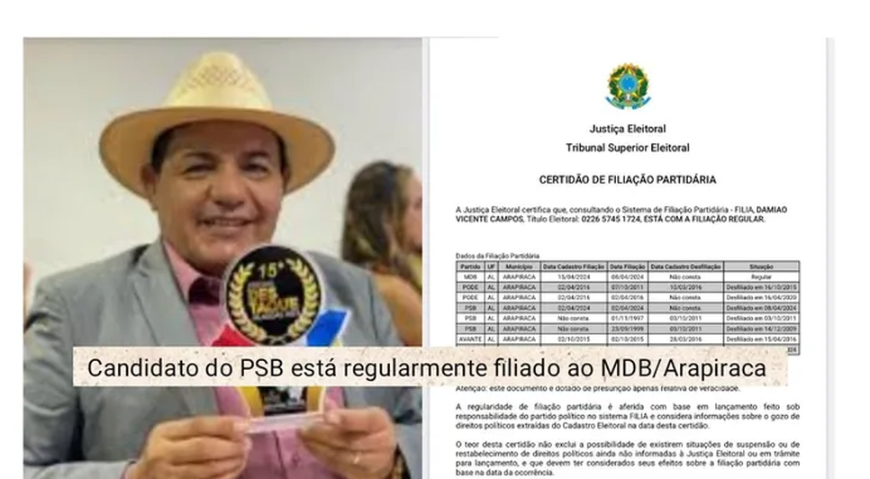 A data da filiação ao MDB, em 8 de abril de 2024, também o deixa fora da disputa, já que os candidatos tiveram até 5 de abril deste ano como prazo final para a troca de legenda partidária.