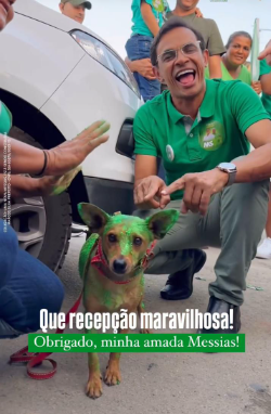O prefeito de Messias, Marcos Silva, está sendo criticado nas redes sociais após postar foto acompanhado de um cachorro pintado de tinta spray de cor verde. O crime contra o animal ocorreu durante a carreata política do candidato, no sábado (24).