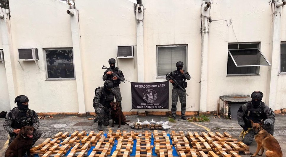 Cães farejadores da Polícia Militar do Rio de Janeiro localizaram uma tonelada de maconha dentro de dutos de ar na área externa de uma escola, no Complexo da Maré. A droga estava dividida em 250 tabletes e foi achada no domingo (25). Apesar do volume de drogas, nenhum suspeito foi detido.
