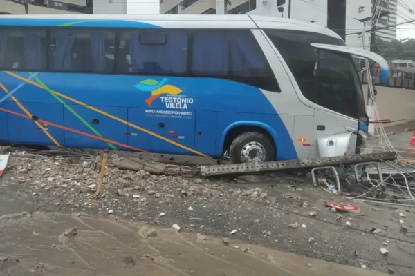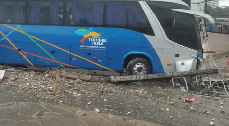Na manhã desta terça-feira (27), um ônibus de Teotônio Vilela, Alagoas, colidiu com um poste na avenida Leste-Oeste, em Mangabeiras, Maceió. A batida derrubou a fiação e deixou o veículo atravessado, bloqueando a pista nos dois sentidos. Devido ao risco de eletricidade, os passageiros foram mantidos dentro do ônibus até a chegada da Equatorial.