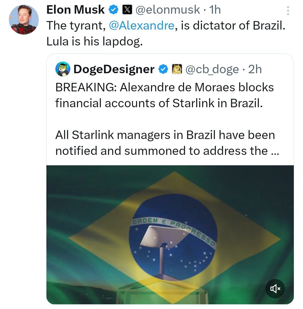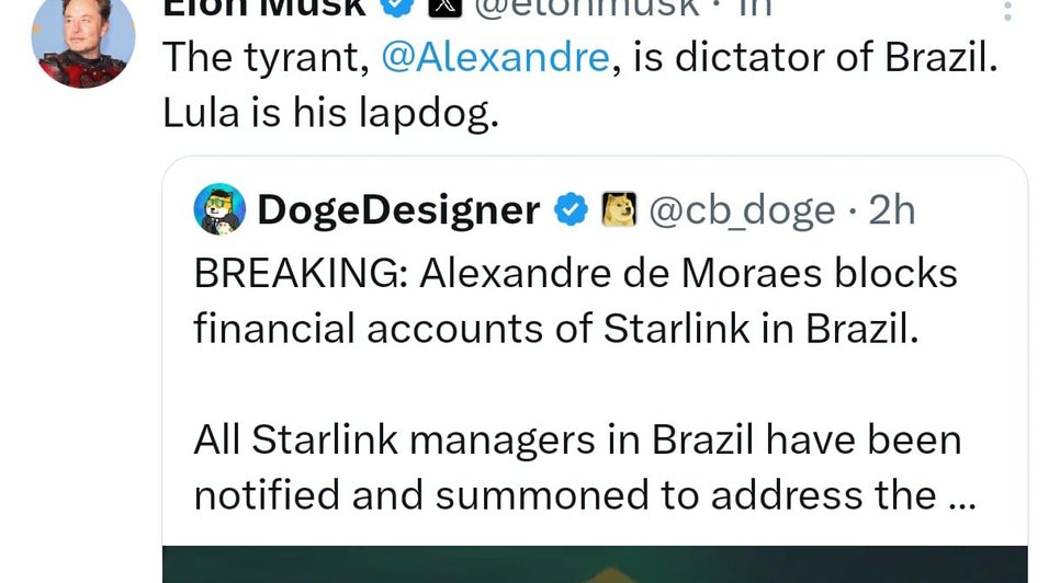 “O tirano, Alexandre de Moraes, é ditador do Brasil. Lula é seu cachorrinho”, escreveu Elon Musk, ao compartilhar um post com a notícia sobre o bloqueio dos valores da Starlink determinado pelo Judiciário do Brasil.