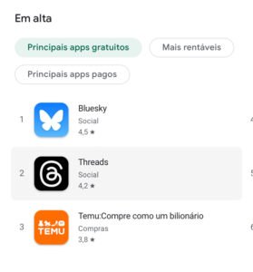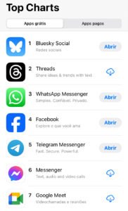 Entre sexta e sábado (31), a BlueSky se tornou o aplicativo de redes sociais mais baixado no Brasil, alcançando a primeira posição tanto na Apple quanto no Android.