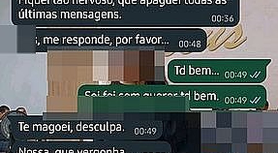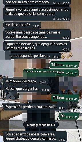 A adolescente fez “print” da conversa com o diretor em que mostra ele se desculpando por ter mandando a foto. Ele alega que não sabe mexer no foco da câmera e diz que não quer perder a amizade da aluna.