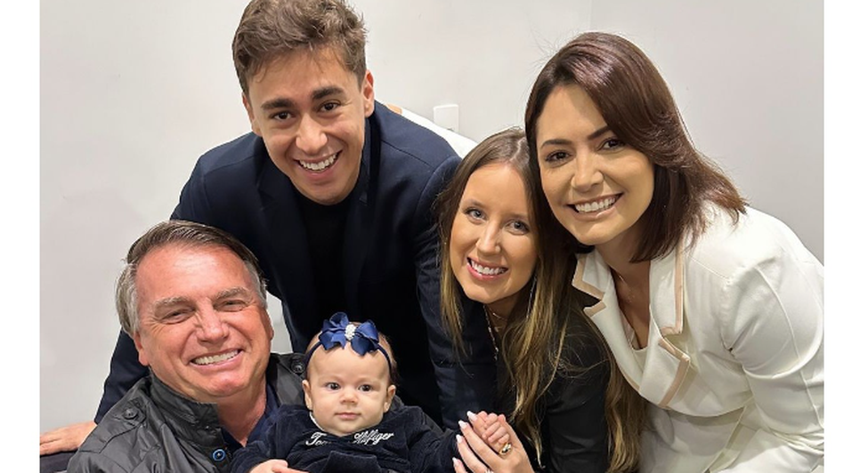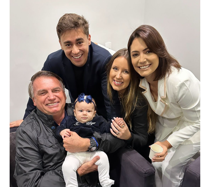 Na ocasião, o parlamentar tirou uma foto com sua filha, a esposa ao lado do ex-presidente Jair Bolsonaro (PL) e Michelle.