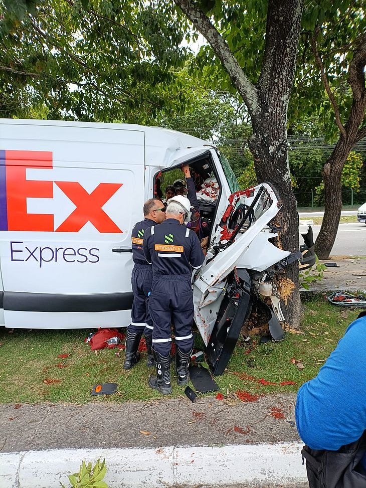 A frente da van ficou completamente destruída e o veículo permanece no local do acidente.