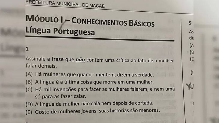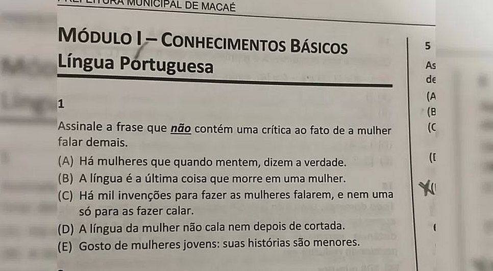 Uma das questões pedia para identificar uma frase que "não contivesse uma crítica ao fato de a mulher falar demais", incluindo opções como "A língua da mulher não cala nem depois de cortada". Outra questão comparava mulheres a defeitos da natureza e robôs.