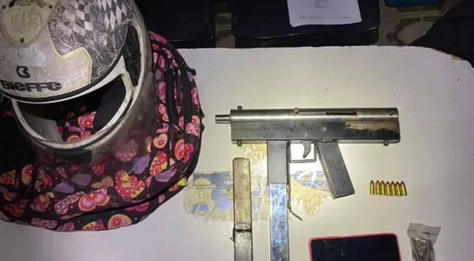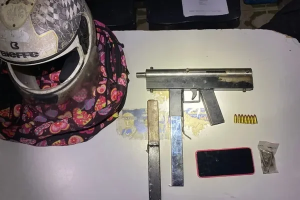 Durante a abordagem, os policiais encontraram uma submetralhadora artesanal com o suspeito. Além disso, foi constatado que ele já possuía antecedentes criminais por receptação, o que agravou a sua situação.
