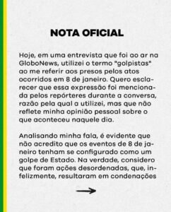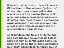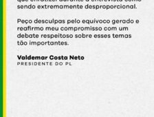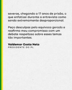 O presidente nacional do Partido Liberal (PL), Valdemar Costa Neto, se desculpou após ter chamado os condenados do 8 de janeiro de "golpistas". A expressão foi usada durante uma entrevista concedida ao vivo ao programa Estúdio i., na tarde da segunda-feira (28). Como retratação, o líder publicou uma nota em seu perfil nas redes sociais.